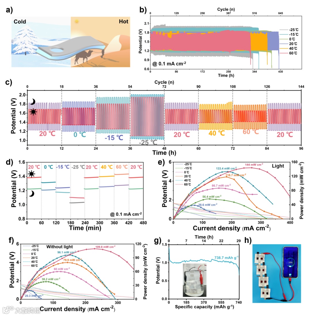 解耦的柔性可充电锌空气电池(FRZAB),在光照下显示出良好的性能且能够在宽温域以及恶劣天气下运行。组装的FRZABs能够在-25至60 °C温度范围内稳定充放电循环300h以上。在宽温度范围内,该系统在光照下展示了多种应用场景:一个光辅助FRZAB可以为玩具车供电,四个光辅助FRZABs串联可以为智能手机充电。