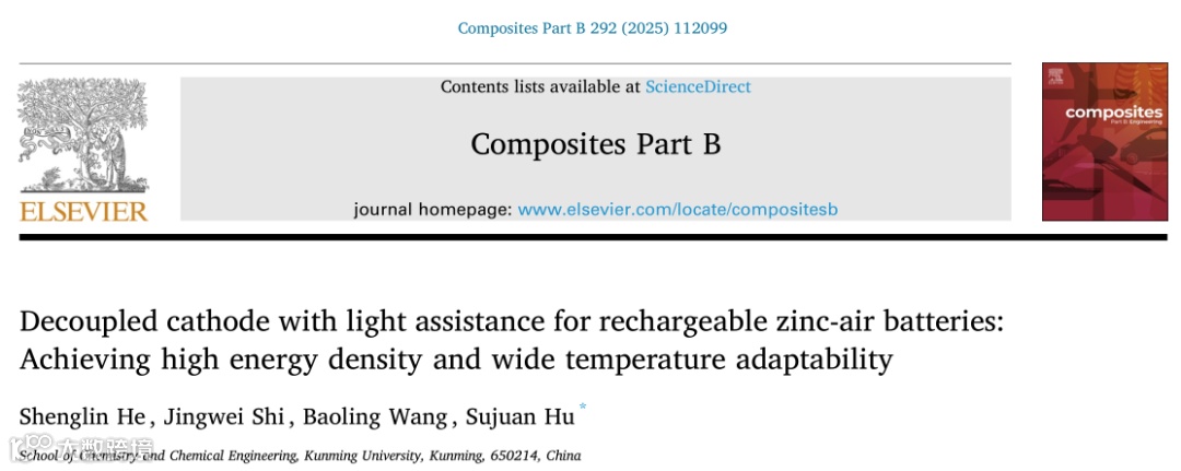 基于此,昆明学院胡素娟课题组在国际期刊Composites Part B上发表的题为“Decoupled cathode with light assistance for rechargeable zinc-air batteries: Achieving high energy density and wide temperature adaptability”的研究论文。该研究通过解耦策略使每个阴极都能在最佳条件下运行,并允许在高电流密度下高效工作,同时在宽温度范围内保持出色的性能。光的引入显著加速了阴极反应动力学,显著提高了RZABs的整体性能。因此,该系统展示了1021.42 mWh g-1的高能量密度和在5 mA cm-2的电流密度下卓越的循环稳定性和寿命(1064小时循环寿命和1596个循环,放电电位1.26 V,充电电位2.12 V,往返效率59.4%)。基于此,研究人员还开发了一种解耦的柔性可充电锌空气电池(FRZAB),在光照下显示出良好的性能。更重要的是,它在极端和恶劣环境下展现出良好的适应性和稳定性。该系统在光照下展示了多种应用场景:一个光辅助FRZAB可以为玩具车供电,四个光辅助FRZABs串联可以为智能手机充电。这种独立阴极和光辅助的结合为提高FRZABs的性能提供了新的方向。