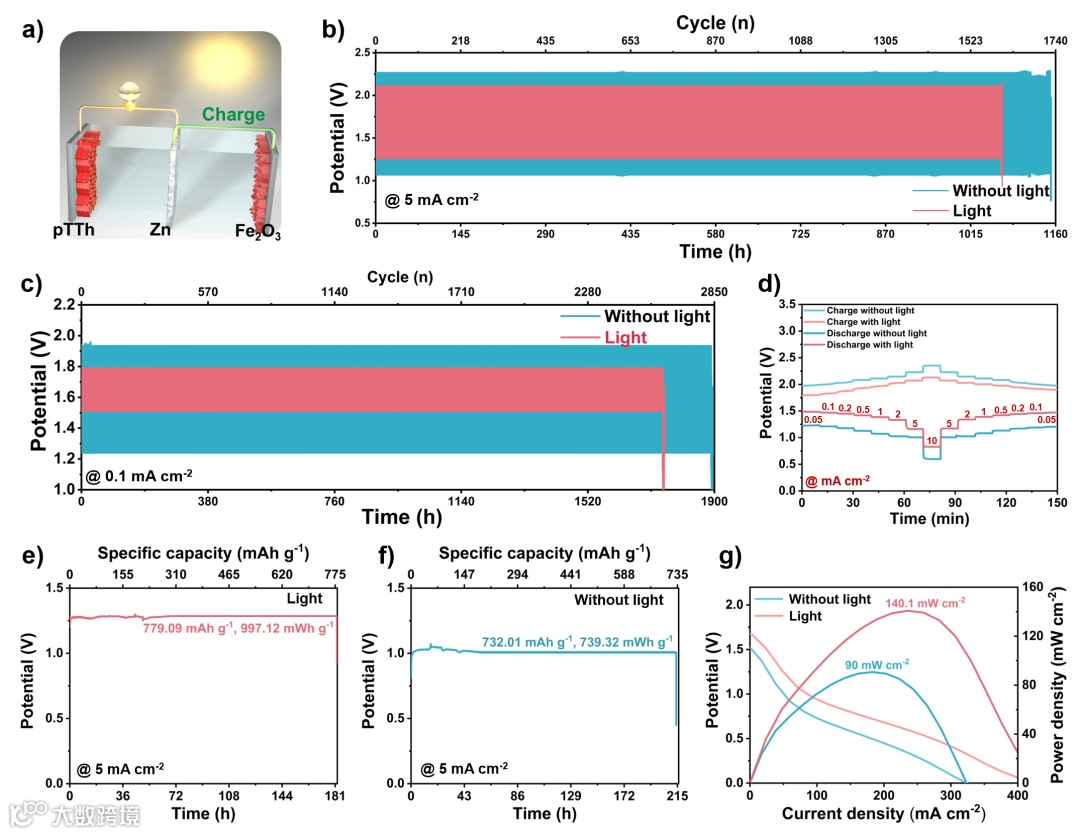 图5. (a)光辅助双阴极RZABs(pTTh|Zn||Fe2O3)的结构图;RZABs分别在(b)5和(c)0.1 mA cm−2下,有无光照的充放电循环曲线;(d) RZABs在0.05–10–0.05 mA cm−2的电流密度下,有无光照时的充放电曲线;RZABs在5mA cm-2下,(e)光照和(g)无光照的比容量和放电时间;有无光照时RZABs的放电极化和功率密度曲线。
