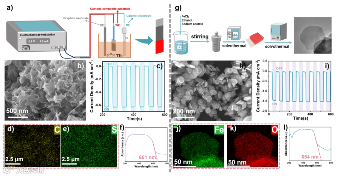 图2. (a)pTTh和(g)Fe2O3的制备流程图;(b)pTTh和(h)Fe2O3的扫描电子显微镜(SEM)图像;(c)pTTh和(i)Fe2O3在有光照和无光照条件下的光电流响应;pTTh中(d)C和(e)S的元素映射;Fe2O3中(j)Fe和(k)O的元素映射;(f)pTTh和(l)Fe2O3的紫外-可见DRS光谱。