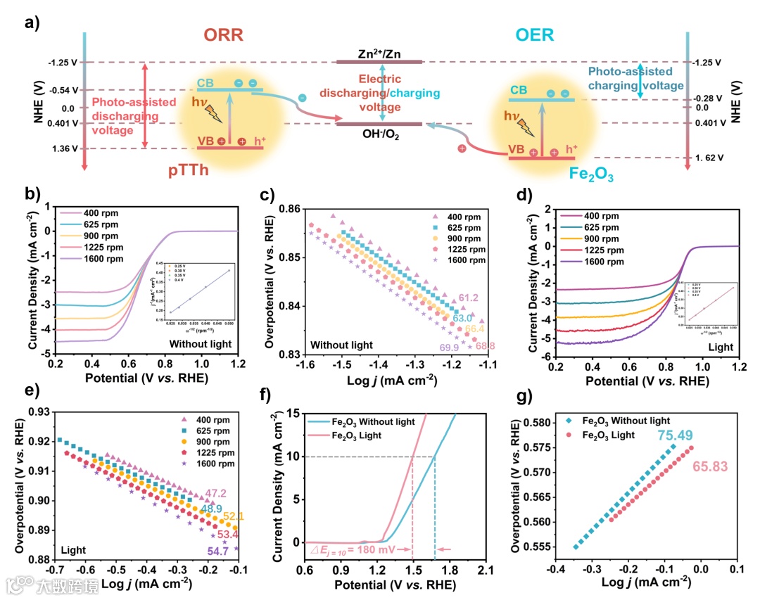 图4. (a) 基于光辅助pTTh|Zn||Fe2O3的RZABs示意图;pTTh无光照(b和c)和有光照(d和e)的LSV和Tafel斜率;(f)Fe2O3的 LSV和(g)有无光照时Fe2O3Tafel斜率。