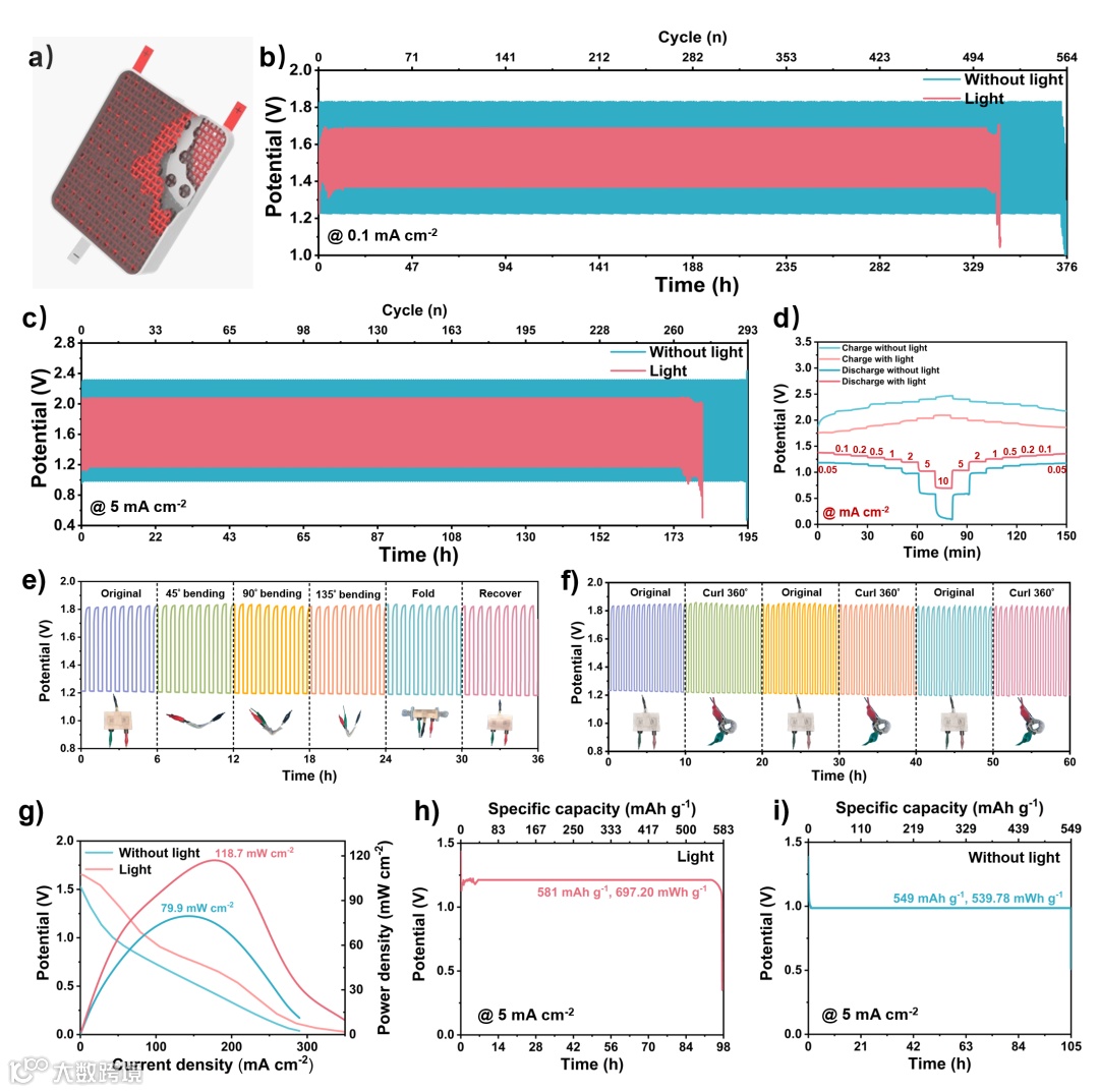 图6. FRZABs的结构图;在(b)0.1和(c)5 mA cm−2时FRZABs在有无光照下的充放电循环曲线;(d) FRZABs在0.05–10–0.05 mA cm-2下的充放电曲线;FRZABs在(e)不同弯曲角度和(F)不同曲率下的充放电循环曲线;(g) FRZABs在有无光照条件下的放电极化和功率密度曲线;FRZABs在5mA cm-2时(h)有光照和(i)无光照的比容量和放电时间。