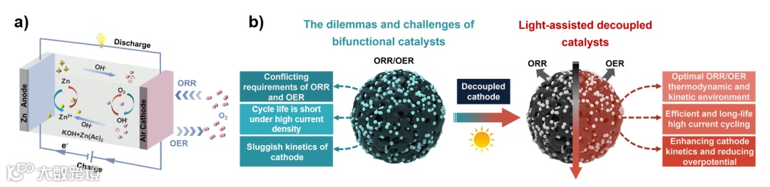 图1.(a)RZABs的工作原理;(b)RZABs阴极中双功能催化剂面临的主要挑战,以及光辅助解耦阴极的设计和优势。
