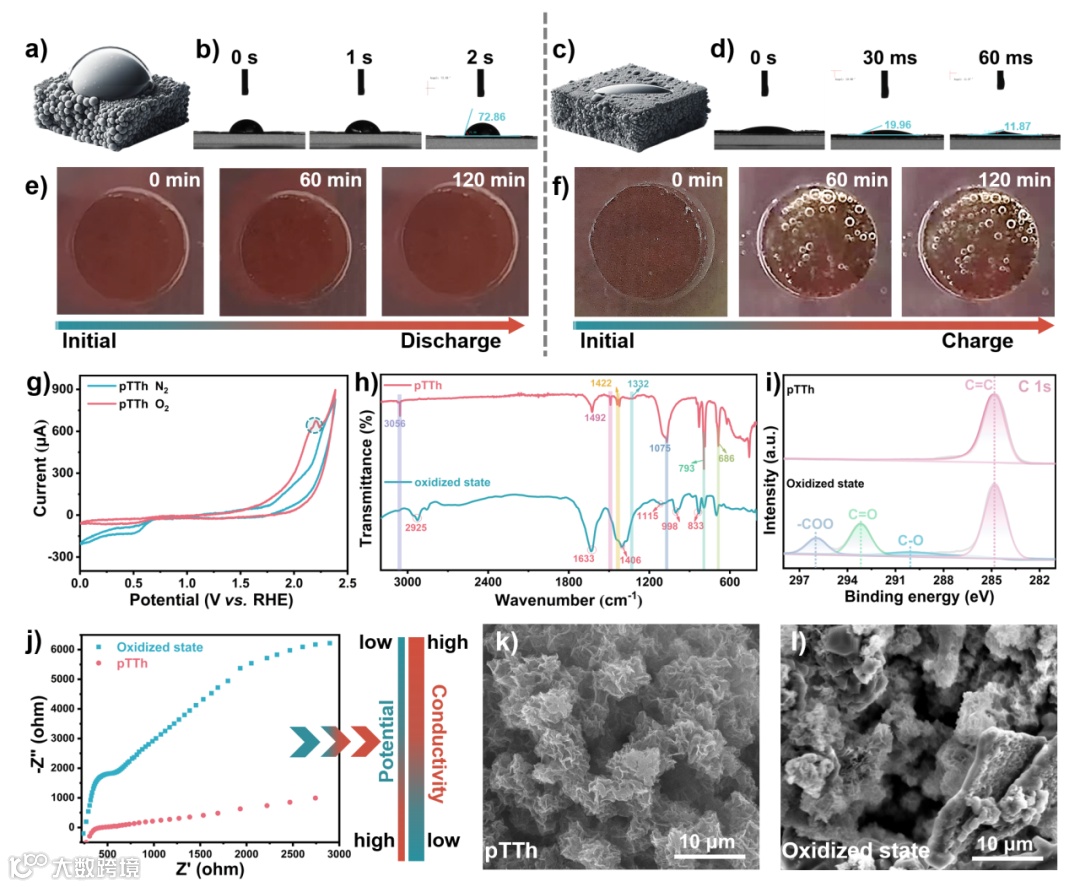 图3. 测量(a和b)pTTh和(c和d)Fe2O3的接触角;基于pTTh|Zn||Fe2O3 RZABs在(e)不同放电时间的去耦pTTh阴极和在(f)不同充电时间的去耦Fe2O3阴极的电极表面的数字图像;(g) pTTh电极的CV测试;(h) pTTh及其氧化态的红外;(i) pTTh中C 1s及其氧化态的XPS;(j) pTTh及其氧化态的EIS;(k)pTTh和(l)其氧化态的SEM。