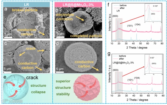 Fig 5 Morphology and structure after 200 cycles at 1 C. SEM image of (a, c) LR and (b, d) LR@S@Mn2O3-3%; (e) cycle diagram; XRD pattern of (f) LR and (g) LR@S@Mn2O3-3%.