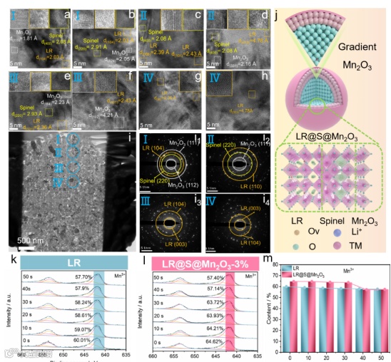 Fig. 2.FIB-TEM, diffraction patterns and XPS spectra of LR and LR@S@Mn2O3-3%. (a–h) TEM diagram, (i) diffraction diagram, and (j) Structure diagram of LR@S@Mn2O3-3%. (k, l) Mn 2p of all samples after etch; (m) Mn3+ content changes after etch.