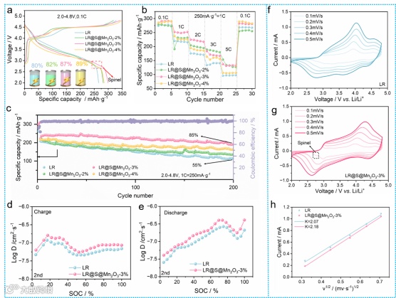 Fig. 4 The electrochemical performance of the LR and LR@S@Mn2O3. (a) Initial charge–discharge curves for all samples at 0.1C; (b) The rate performance; (c) The cyclic performance at 1C; (d, e) Li+ diffusion rate calculated by GITT method after 1 cycle at 0.1C; (f-h) CV at different scan rates (0.1-0.5 mV·s-1).