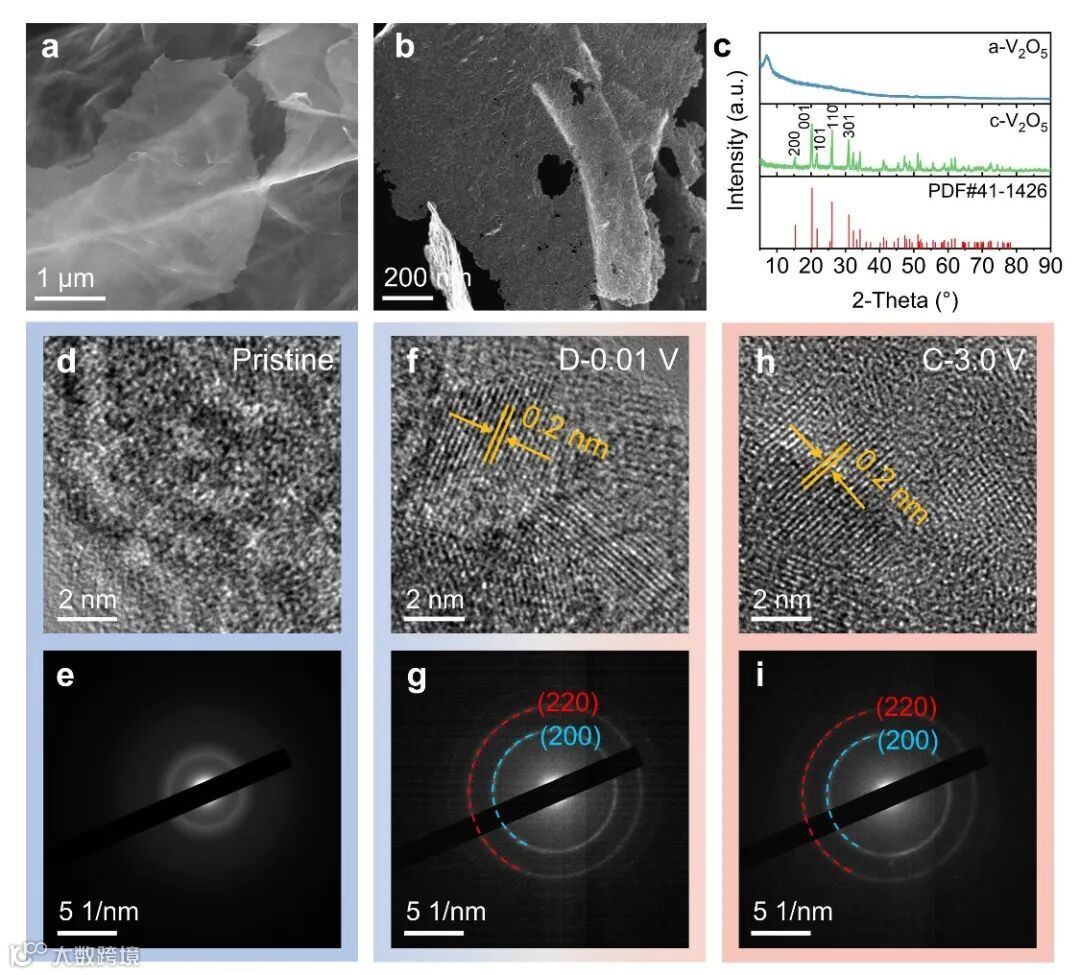 图1. 电化学诱导 a-V2O5转化为a-DRS-LVO的表征测试。a,a-V2O5纳米片的SEM图像;b,a-V2O5纳米片的TEM图像;c,a-V2O5和c-V2O5的XRD图样;d-i,样品在不同状态下的HRTEM和SAED图像。