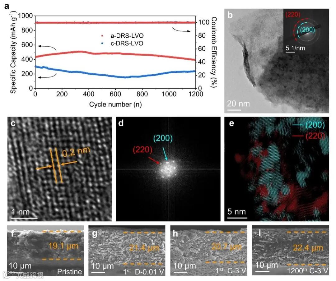 图3. a-DRS-LVO电极的长循环稳定性。a,循环性能;b-c,长循环后a-DRS-LVO的透射图;d-e,FFT和反FFT图像;f-i,不同状态下的极片厚度。