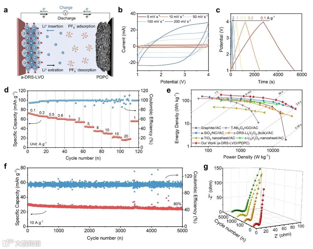 图4. a-DRS-LVO//PDPC电容器电化学性能。a,示意图;b,CV曲线;c,对称充放电曲线;d,倍率性能;e,拉贡曲线;f,循环性能;g,不同循环后的EIS。