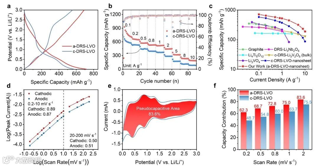 通过倍率性能测试,a-DRS-LVO在0.1 A/g的电流密度下能够提供716.8 mAh/g的高比容量,这远高于c-DRS-LVO(578.5 mAh/g)和其他DRS电极以及常用的商业石墨电极。通过a-DRS-LVO在不同扫速下的CV曲线可获得其阳极峰和阴极峰的b值分别为0.87和0.89,表明其动力学主要由表面控制和电容主导。并且通过赝电容占比计算得到具有更小结晶尺寸的a-DRS-LVO的赝电容占比高于c-DRS-LVO,说明小尺寸纳米晶结构a-DRS-LVO具有更快的动力学性能。