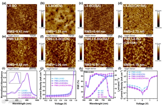 为了验证双添加剂策略的普适性,进一步探究了双添加剂对其他BTP衍生物(BTP-eC9、N3、L8-BO)聚集行为的影响。结果发现,添加双添加剂后的薄膜表面形貌同样发生了极大的改变,尤其是在L8-BO中可观察到致密的纤维结构形成。基于PM6:L8-BO的器件获得了19.59%的冠军PCE,是目前二元BHJ器件的最高记录之一。PM6:L8-BO (CN+BA)的EQE谱在700 ~ 850 nm范围内显著增强,表明CN和BA添加剂的协同作用增强了受体材料的光子到电子转换,与PM6:Y6 (CN+BA)体系的结果一致。这也充分证明了通过双添加剂方法调制受体相位的可行性。