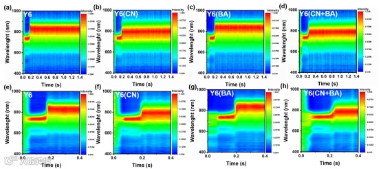 图2. Y6、Y6:CN、Y6:BA和Y6:CN+BA旋涂过程中的原位吸收
