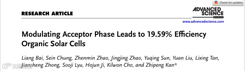 广西大学阚志鹏教授团队,在国际知名期刊Advanced Science上发表题为“Modulating Acceptor Phase Leads to 19.59% Efficiency Organic Solar Cells”的研究论文。该文章提出了一种调节非富勒烯受体聚集行为的新策略,即结合挥发性固体添加剂BA和高沸点添加剂CN。该策略能够调控一系列非富勒烯受体的聚集,观察到薄膜表面形貌发生重大改变,尤其是促进了L8-BO中分子结构致密的细纤维的形成,在活性层中实现激子解离和电荷收集之间的最佳平衡。结果表明,在700-850纳米波长范围内,最佳设备的外部量子效率显著提高。最终,获得了最高19.59%的PCE。这些结果揭示了一种方便有效的控制非富勒烯受体形态并提高有机太阳能电池光伏性能的方法,为更高效、实用的有机光伏技术铺平了道路。