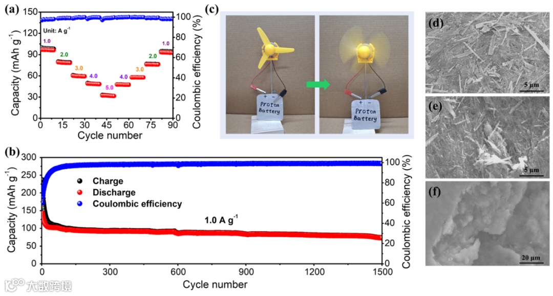 Figure 4. (a) Rate performance, (b) charge-discharge cycling stability and Coulombic efficiency of the solid-state proton battery with MeSA@sCOF electrolyte. (c) An electrical fan driven by the solid-state proton battery. SEM images of (d) as-prepared MoO3 membrane anode, (e) MoO3 membrane anode in solid-state proton battery utilizing MeSA@sCOF as electrolyte after 1500 charge-discharge cycles at 1.0 A g−1, and (f) MoO3 membrane anode in proton battery with H2SO4 (1M) aqueous electrolyte after 400 charge-discharge cycles at 1.0 A g−1.