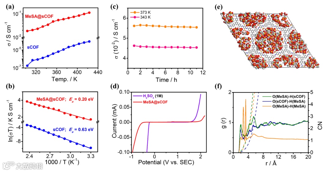 Figure 3. (a) Temperature-dependent proton conductivity and (b) Arrhenius plots of the proton conductivities for sCOF and MeSA@sCOF. (c) Proton-conducting long-term stability of MeSA@sCOF. (d) Linear scanning voltammetry curves of MeSA@sCOF and a H2SO4 (1 M) aqueous solution. (e) Illustration of MD simulation of MeSA@sCOF. (f) Radial distribution functions (RDF) of O(MeSA)-H(sCOF), O(sCOF)-H(MeSA) and O(MeSA)-H(MeSA), along with the coordination numbers (CN).