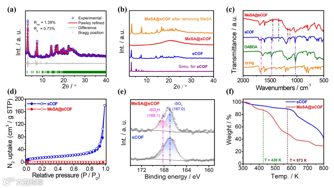 Figure 2. (a) Pawley refinement of PXRD pattern of sCOF. (b) PXRD patterns of sCOF, MeSA@sCOF and MeSA@sCOF after removing MeSA. (c) FT-IR spectra of TFPB, DABDA, sCOF and MeSA@sCOF. (d) N2 adsorption/desorption isotherms, (e) S 2p XPS and (f) TG curves of sCOF and MeSA@sCOF.