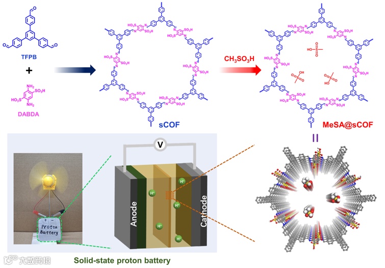 Figure 1. Schematic illustration of the synthesis of MeSA@sCOF, and its application in solid-state proton batteries.