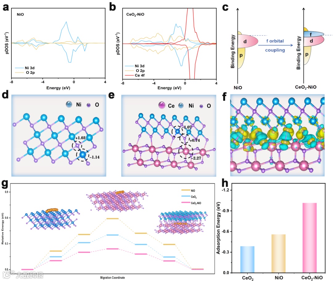 Figure 5. (a) PDOS of NiO. (b) PDOS of CeO2-NiO. (c) The construction of f-p-d gradient orbital coupling with the f band electron buffer. (d) Bader charges of NiO. (e) Bader charges of CeO2-NiO. (f) Charge-transfer diagram (yellow and green indicate the gain and loss of electrons) of CeO2-NiO/CNs. (g) Sodium diffusion path in CeO2-NiO/CNs and counterparts along with the corresponding relative energies. (h) Adsorption energy of CeO2-NiO/CNs.