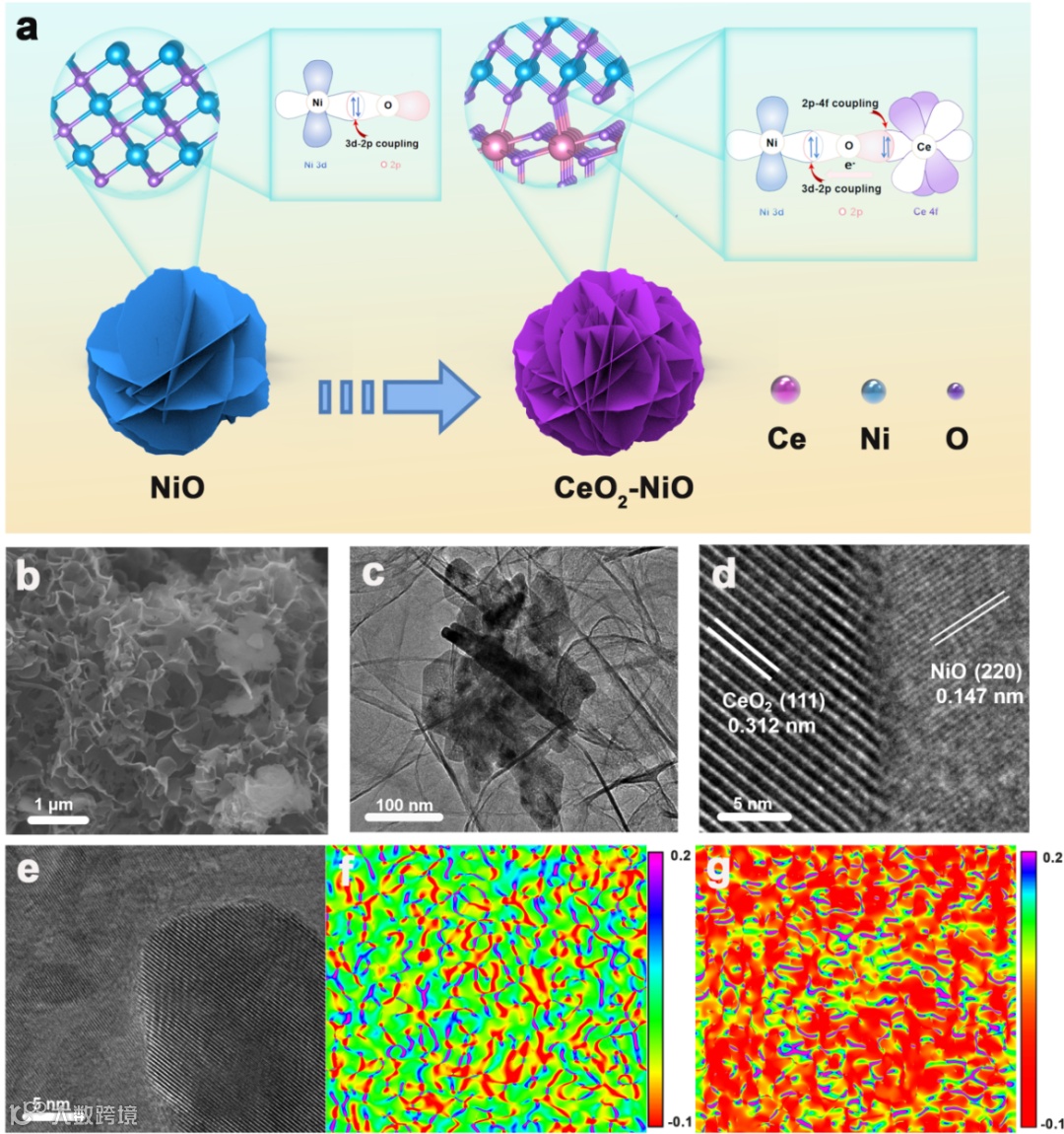 Figure 1. (a) Schematic representation of the synthesis route for CeO2-NiO/CNs. (b) SEM, (c) TEM, and (d, e) HRTEM images of CeO2-NiO/CNs. (f) GPA-derived ϵxx strain map of CeO2-NiO/CNs. (g) GPA-derived ϵyy strain map of CeO2-NiO/CNs.