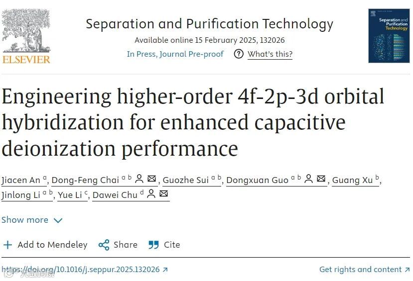 总之,成功构建高阶f-p-d结构框架,以调控NiO中Ni的局部电子轨道结构,从而显著增强钠离子吸附行为和循环稳定性,提升其在模拟海水中钠离子吸附的性能。Ce 4f轨道的引入使Ni的d带中心向费米能级靠近,从而增强吸附钠离子的能量。同时,强p-d杂化增强NiO晶格的稳定性,防止去离子化过程中的结构退化或腐蚀。因此,CeO2-NiO/CNs在海水淡化方面表现出优异的性能,具有38.6 mg g-1的显著吸附容量(SAC)和卓越的循环稳定性。总体而言,本研究提出CeO2-NiO/CNs作为一种有前景的电容去离子(CDI)电极材料,展示通过强健的Ce 4f-O 2p-Ni 3d轨道调控优化钠离子吸附是一种开发高性能电容去离子电极材料的有效途径。