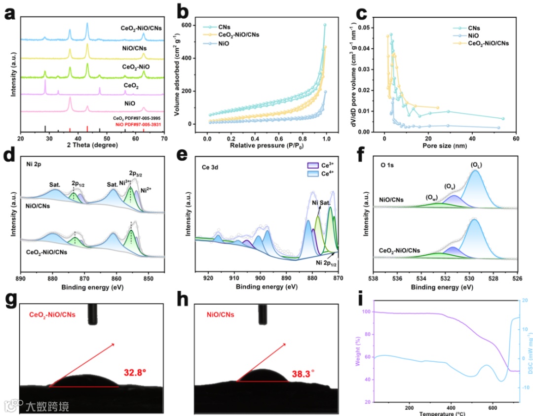 Figure 2. (a) XRD patterns for CeO2-NiO/CNs and counterparts. (b) Nitrogen adsorption-desorption isotherms for CeO2-NiO/CNs and counterparts. (c) Pore diameter distribution for CeO2-NiO/CNs and counterparts. (d) Ni 2p XPS spectra for CeO2-NiO/CNs and NiO/CNs. (e) Ce 3d XPS spectra for CeO2-NiO/CNs. (f) O 1s XPS spectra for CeO2-NiO/CNs and NiO/CNs. The optical image of water contact angle on the surfaces of (g) CeO2-NiO/CNs and (h) NiO/CNs. (i) TG and DSC spectra for CeO2-NiO/CNs.