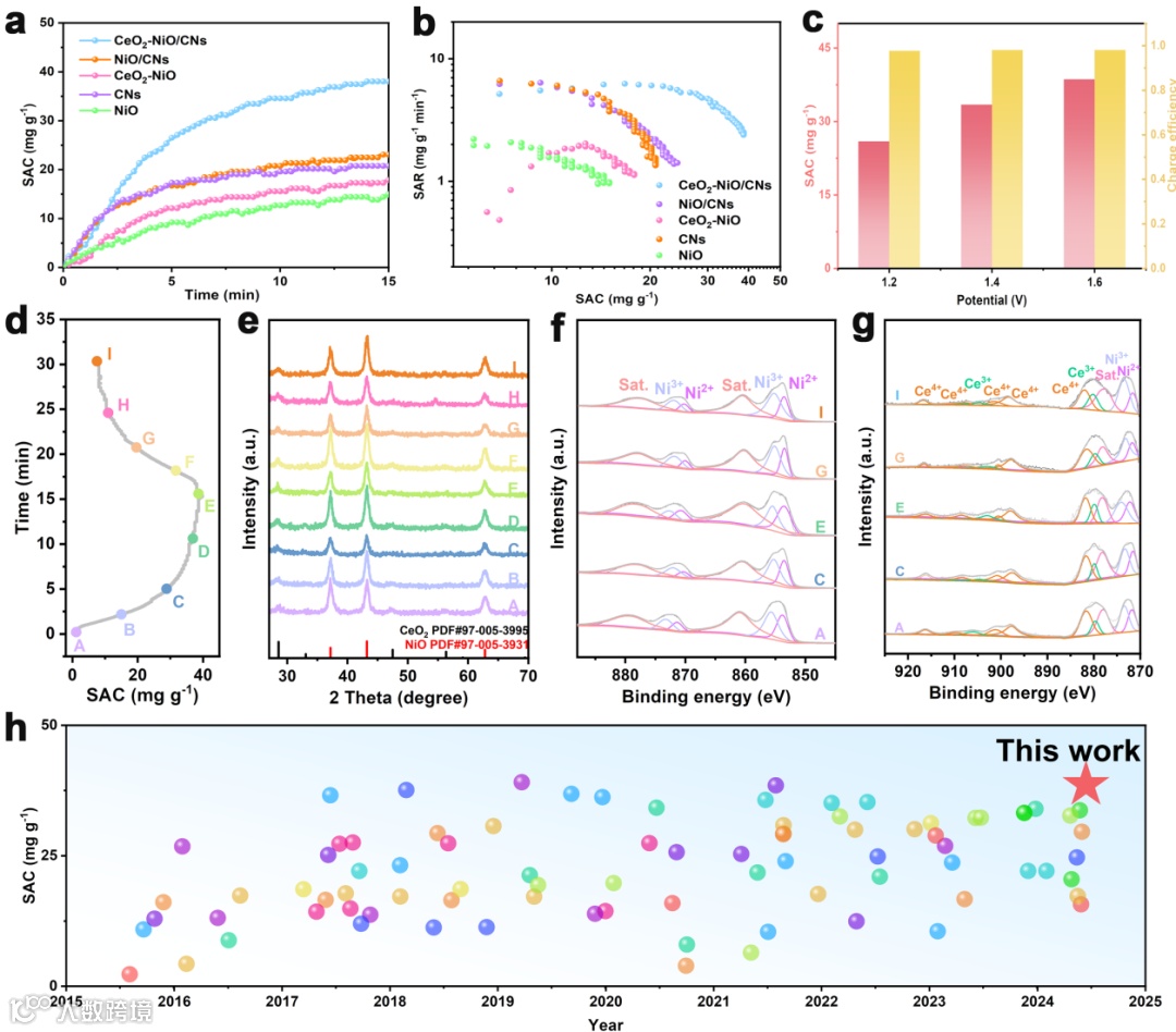 Figure 4. (a) SAC of CeO2-NiO/CNs and counterparts. (b) Ragone plots of CeO2-NiO/CNs and counterparts. (c) SAC and charge efficiencies of CeO2-NiO/CNs at different voltages. (d) SAC of CeO2-NiO/CNs in single CDI charging-discharging cycle. (e) The ex-situ XRD spectra. (f) The ex-situ Ni 2p XPS spectra. (g) The ex-situ Ce 3d XPS spectra. (h) Comparison of the desalination performance of CeO2-NiO/CNs with other reported works.