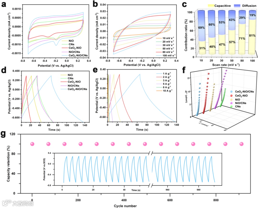 Figure 3. (a) CV curves of CeO2-NiO/CNs and counterparts at 10 mV s-1. (b) CV curves of CeO2-NiO/CNs at scan rates from 10 to 100 mV s-1. (c) Capacitive and diffusion contribution ratio of CeO2-NiO/CNs at different scan rates. (d) GCD profiles of CeO2-NiO/CNs and counterparts at 1 A g-1. (e) GCD profiles of CeO2-NiO/CNs at different current densities. (f) Nyquist plots of the CeO2-NiO/CNs and counterparts. (g) Long-term GCD test of CeO2-NiO/CNs at 3 A g-1.