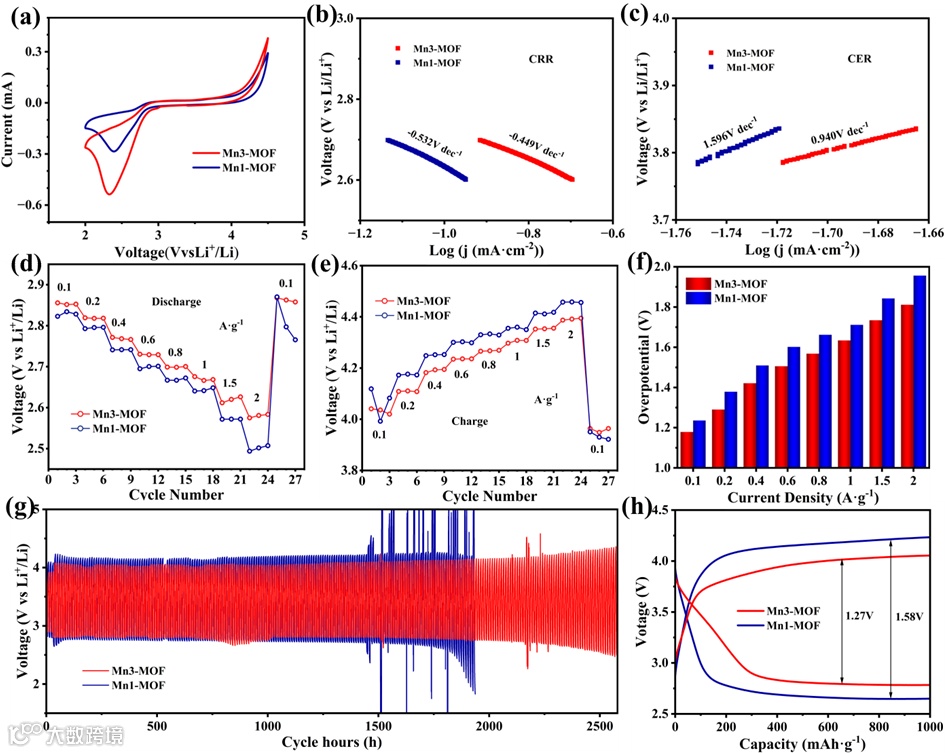 图 5. (a) 在0.2 mV s⁻¹扫描速率下,电压窗口为2.0到4.5 V的CV曲线。(b) CRR 的Tafel斜率。(c) CER的Tafel斜率。(d-f) 在1000 mAh g⁻¹限定容量下的速率性能。(g) 以0.2 A g⁻¹电流密度下的循环稳定性。(h) Mn3-MOF和Mn1-MOF在0.2 A g⁻¹电流密度下,限定容量为1000 mAh·g⁻¹时的充放电曲线。