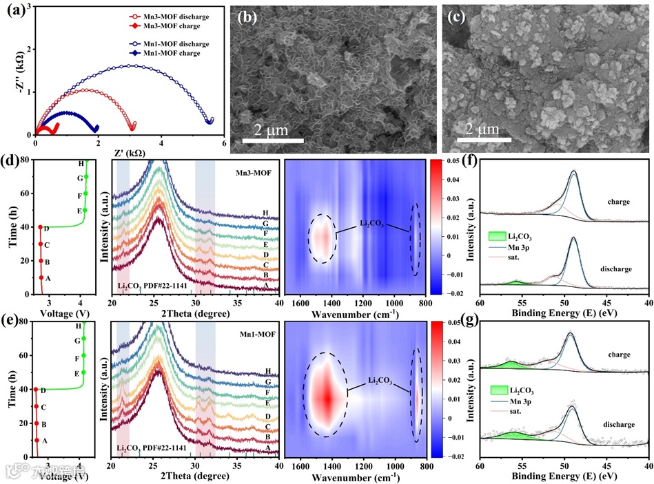 图 6. (a) Mn3-MOF和Mn1-MOF充放电后的电化学阻抗谱。(b) Mn3-MOF放电后的SEM图。(c) Mn1-MOF放电后的SEM图。(d) Mn3-MOF的非原位PXRD和FTIR图。(e) Mn1-MOF的非原位PXRD和FTIR图。(f) 不同状态下的Mn3-MOF的XPS图。(g) 不同状态下的Mn1-MOF的XPS图。