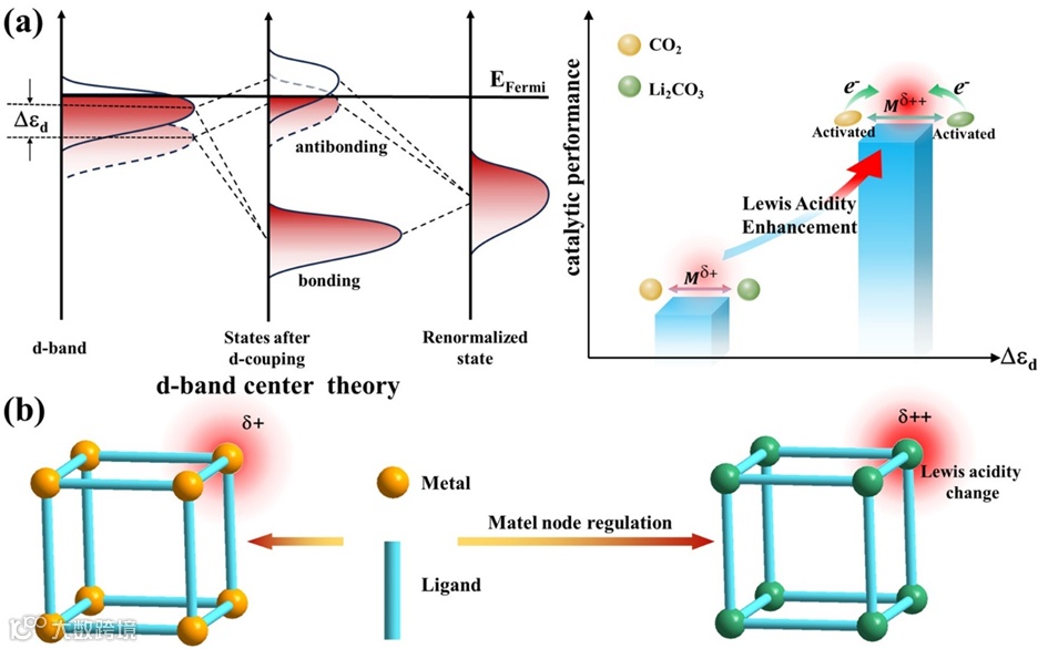 图 1. (a) Li-CO₂电池中路易斯酸性增强策略的示意图。(b) 具有相同中心金属和配体但路易斯酸性不同的MOFs合成示意图。