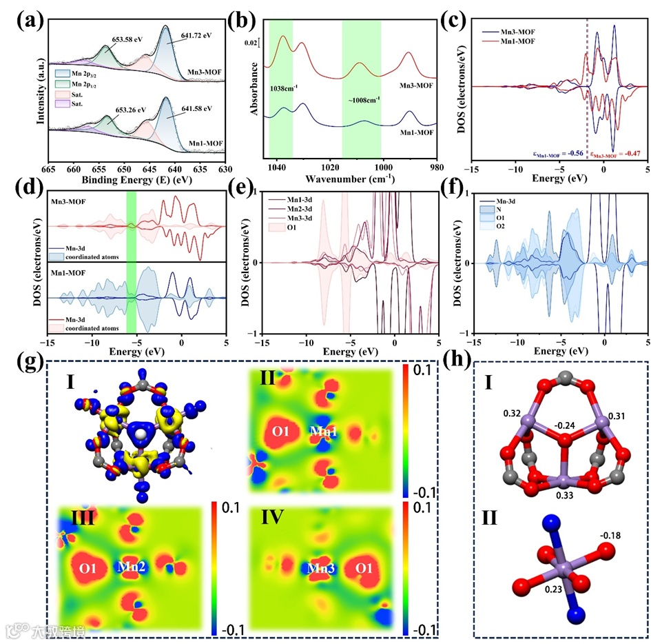 图 3. (a) Mn3-MOF和Mn1-MOF的Mn 2p XPS图。(b) Mn3-MOF和Mn1-MOF的Py-IR图。(c) Mn3-MOF和Mn1-MOF的计算PDOS。(d) Mn-3d及其配位原子的DOS。(e) Mn3-MOF中Mn1、Mn2、Mn3及O1的DOS。(f) Mn1-MOF中Mn及其配位原子的DOS。(g) I) Mn及配位原子的电荷密度差异;II) Mn1,III) Mn2,IV) Mn3与O1的电荷密度差异。(h) I) Mn3-MOF和II) Mn1-MOF的Hirshfeld电荷分布。