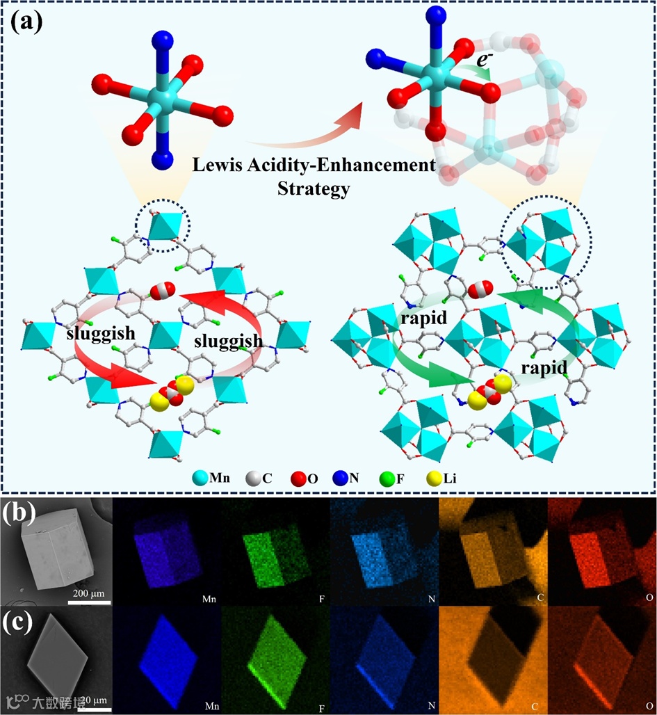 图 2. (a) 基于路易斯酸性增强策略的Mn-MOF材料设计。(b) Mn3-MOF和(c) Mn1-MOF的SEM和EDS图。