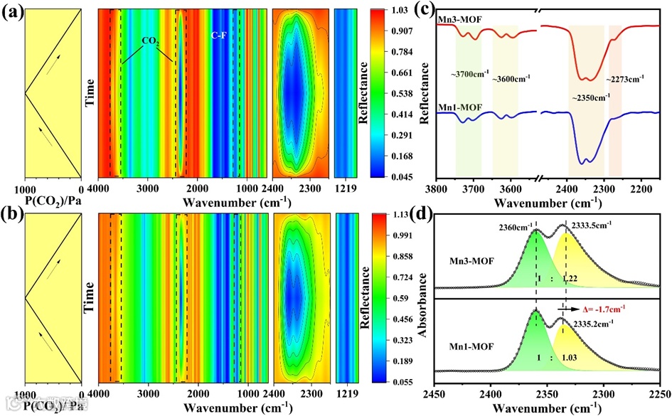 图 4. (a) Mn3-MOF和 (b) Mn1-MOF的原位CO₂吸附-脱附FTIR光谱。(c) 1000 Pa CO₂气氛下Mn3-MOF和Mn1-MOF的FTIR光谱。(d) Mn3-MOF和Mn1-MOF在2350 cm⁻¹附近的FTIR峰面积对比。