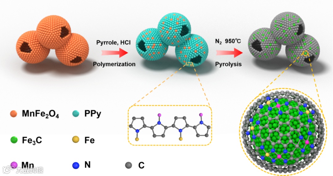 以 MnFe2O4 双金属氧化物为模板,通过吡咯的部分原位聚合,合成了具有异核双金属单原子 FeMn-N6 位点的壳层耦合 Fe3C 纳米粒子核的催化剂。表征结果进一步证明,催化剂中的Fe3C颗粒表面存在约3-5nm厚的碳包覆壳层,且壳层中含有大量FeMn-N6 异核双单原子位点。