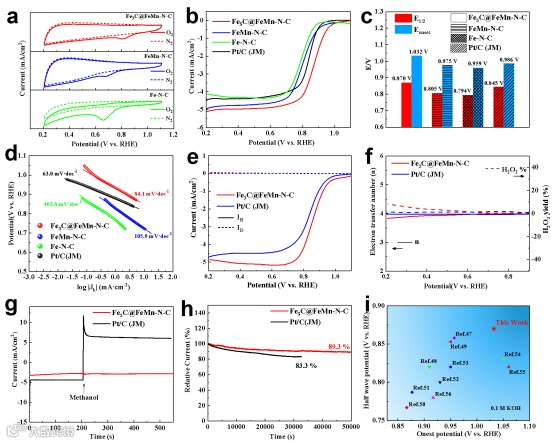 Fig. 4. a, b) CV and LSV curves of Fe3C@FeMn-N-C, FeMn-N-C, Fe-N-C and Pt/C catalysts in O2 saturated 0.1 M KOH solution. c) Comparison of the Eonset and E1/2 of Fe3C@FeMn-N-C, FeMn-N-C, Fe-N-C and Pt/C catalysts. d) Corresponding Tafel plots obtained from the RDE polarization curves. e) RRDE polarization curves of Fe3C@FeMn-N-C and Pt/C catalysts. f) H2O2 yield and electron transfer number (n) in 0.1 M KOH solution. g) Methanol tolerance and h) chronoamperometric response for Fe3C@FeMn-N-C and Pt/C at 0.600 V vs. RHE potential. i) Comparison of the half-wave potential and onset potential of MCx ORR catalysts.