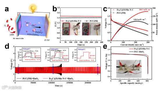 Fig. 5. a) Schematic representation of the liquid rechargeable ZAB. b) Open-circuit potential curves of ZAB. c) Polarization and power density curves of the primary ZAB of the Fe3C@FeMn-N-C and Pt/C catalyst in O2 saturated 6 M KOH solution. d) Charge−discharge cycling performance of rechargeable ZAB at a constant charge−discharge current density of 10 mA cm−2. e) Long-term discharge curves of ZAB (inset is physical photos).