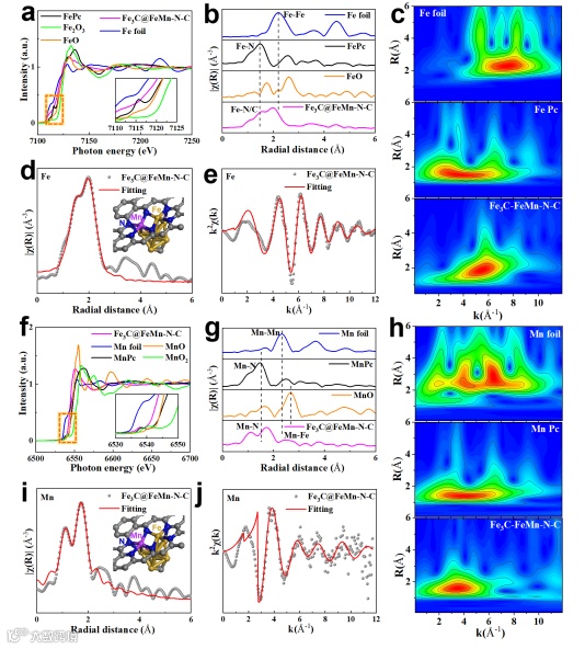 Fig. 3. a) Fe K-edge XANES and b) Fourier-transform EXAFS spectra of Fe3C@FeMn-N-C and reference samples. c) EXAFS WT analysis. d, e) EXAFS fitting curves of Fe3C@FeMn-N-C in the R-space and K-space. f) Mn K-edge XANES and g) Fourier-transform EXAFS spectra of Fe3C@FeMn-N-C and reference samples. h) EXAFS WT analysis. i, j) EXAFS fitting curves in the R-space and K-space.
