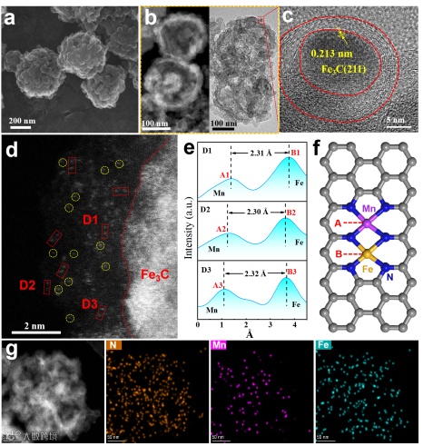 Fig. 2. a) SEM image, b, c) HR-TEM image, d) HAADF-STEM image of Fe3C@FeMn-N-C. e) The intensity profiles obtained on bimetallic Fe–Mn sites. f) structure diagram of Fe3C@FeMn-N-C. g) EDS elemental mapping of Fe3C@FeMn-N-C.
