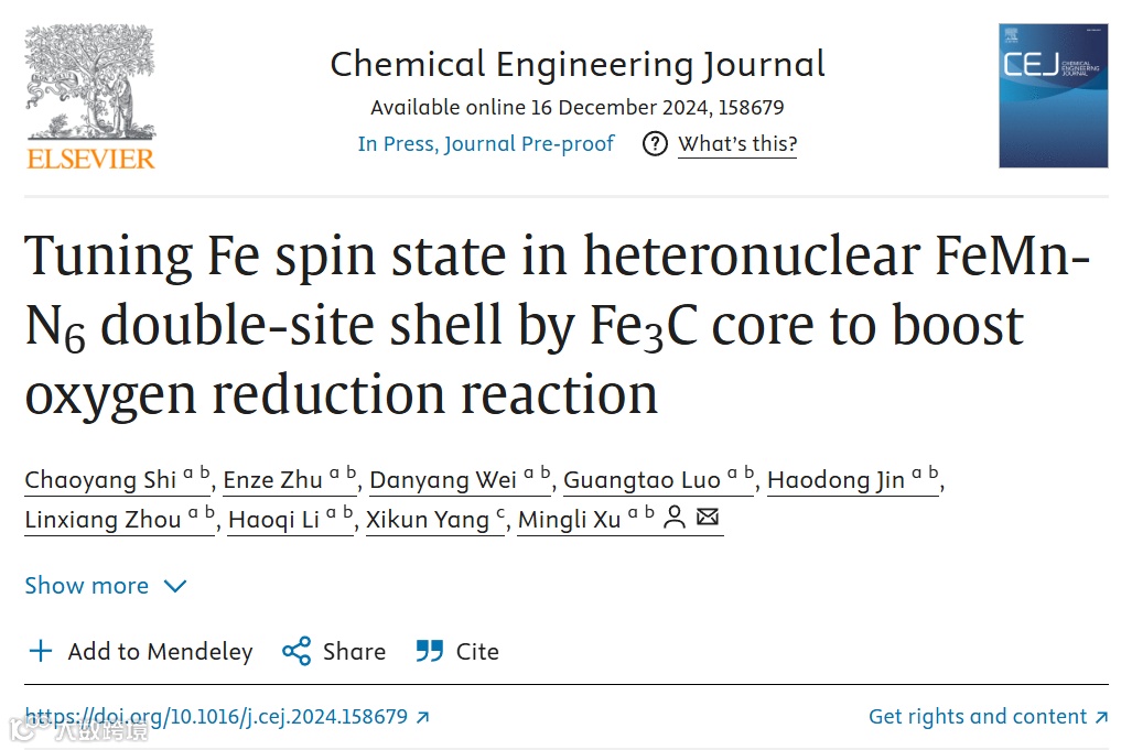利用Fe3C 核调控壳层中FeMn-N6 异核双位点上Fe 自旋态以促进氧还原反应