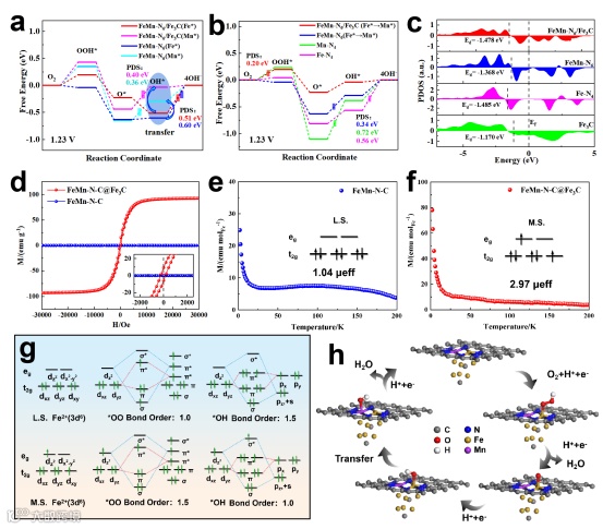 DFT理论计算和零场冷却(ZFC)表征结果表明,Fe3C核引发的壳应变能够将FeMn-N6位点中的Fe自旋态由低自旋态(L.S.)调节为中自旋态(M.S.)。自旋态的改变,调节了反应中间体(*OO、*OH)的吸附强度,从而激活了FeMn-N6异核双位点间的接力催化,降低了电位决定步骤(PDS)能垒,增强了ORR催化性能。