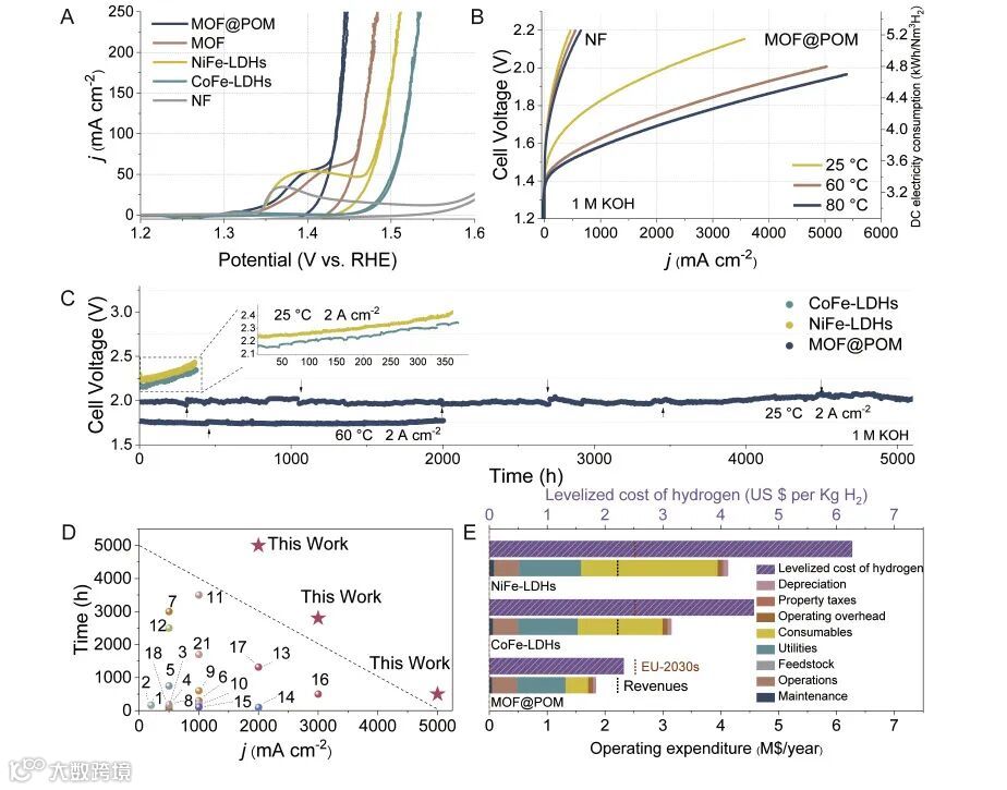 MOF@POM的活性和实际运行中的稳定性(A-C)。该工作和其他已报道的碱性阴离子膜电解水电解槽的参数对比以及经济效应分析(D-E)。