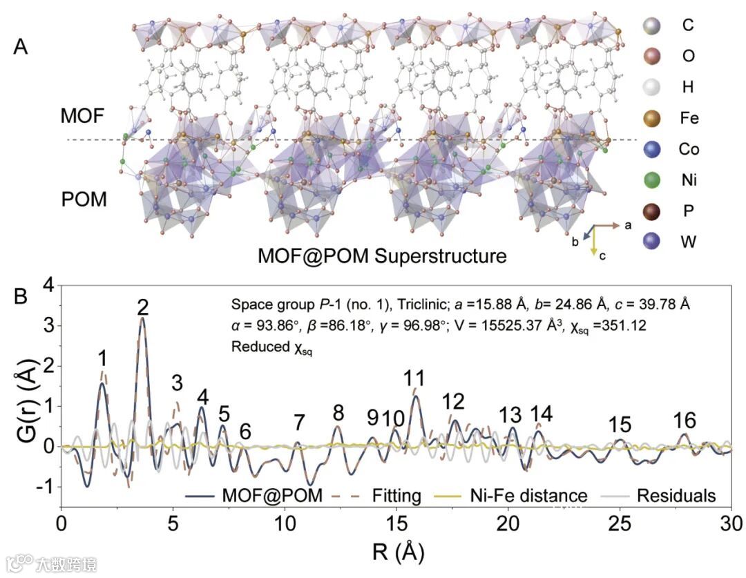 针对上述问题,研究团队创新性的提出了多酸接枝固定水氧化活性位点设计方法,首次制备出了高效多酸接枝的单层钴铁氢氧化物超结构水氧化催化剂。该方法首先通过定向接枝方法,将二维钴铁金属有机骨架(CoFe-MOF)与多金属氧酸盐(Ni-POM)组装,获得多酸接枝的金属有机骨架(MOF@POM)超结构。在电催化水氧化过程中,该超结构中CoFe-MOF原位转化重构为单层钴铁氢氧化物(CoFe-LDH),并通过Ni-O桥以共价键与POM连接。研究人员进一步揭示了包括钴、铁活性位点和镍、钨调控位点在内的多位点协同、功能集成的稳定性设计新原理。原位电化学谱学研究发现,该结构中钴和铁位点作为活性中心其价态不断升高,而镍氧桥和钨氧骨架作为配位调节基元其价态规律振荡,多酸出色的氧化还原特性有效解决了现有水氧化金属活性位点氧化还原不可逆调控难题。实验结合理论进一步证实Ni-O桥通过晶格应变释放稳定Co/Fe催化活性位点,多酸中金属W价态振荡(W5+/6+)动态调控电子密度;同时多酸基元协同降低氧活化能垒,形成应力-电子双层维度稳定机制,从而突破了传统催化剂的性能瓶颈。