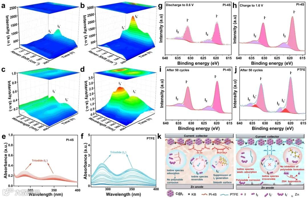 图4 AC@I2正极采用(a)PI-4S和(b)PTFE粘结剂在电池循环过程中的原位拉曼光谱,(c,d)原位紫外-可见吸收光谱和(e,f)相应紫外可见吸收光谱的定量比较;AC@I2正极采用PI-4S粘结剂在(g)完全放电状态和(h)完全充电状态,以及采用(i)PI-4S和(j)PTFE粘结剂的AC@I2正极在50次循环后的XPS谱图;(k)PI-4S和PTFE粘结剂在Zn//AC@I2电池体系中的作用机制示意图。
