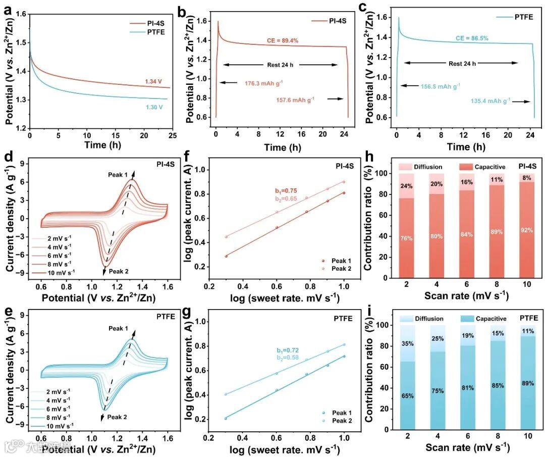 图3(a-c)基于PI-4S和PTFE电池的抗自放电特性;(d)PI-4S和(e)PTFE两种粘结剂体系在2-10 mV s-1扫速范围内的CV曲线;通过采用(f)PI-4S和(g)PTFE粘结剂的Zn//AC@I2电池中的氧化还原峰值电流确定b值;(h)PI-4S和(i)PTFE粘结剂的Zn//AC@I2电池在不同扫速下的电容贡献率。