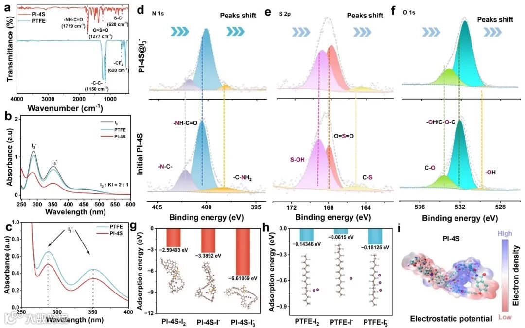 图1 PI-4S和PTFE粘结剂的(a)FT-IR和(b)吸附多碘化物溶液前后剩余溶液的UV-vis光谱;(c)不同粘结剂的Zn@I2正极在KI溶液中浸泡3天后溶液的UV-vis光谱。PI-4S粘结剂吸附多碘化物前后的(d)N 1s、(e)S 2p和(f)O 1s高分辨率光谱;DFT计算关于(g)PI-4S和(h)PTFE粘结剂分别与I2、I-和I3-物种的吸附能;(h)PI-4S分子的静电势图。