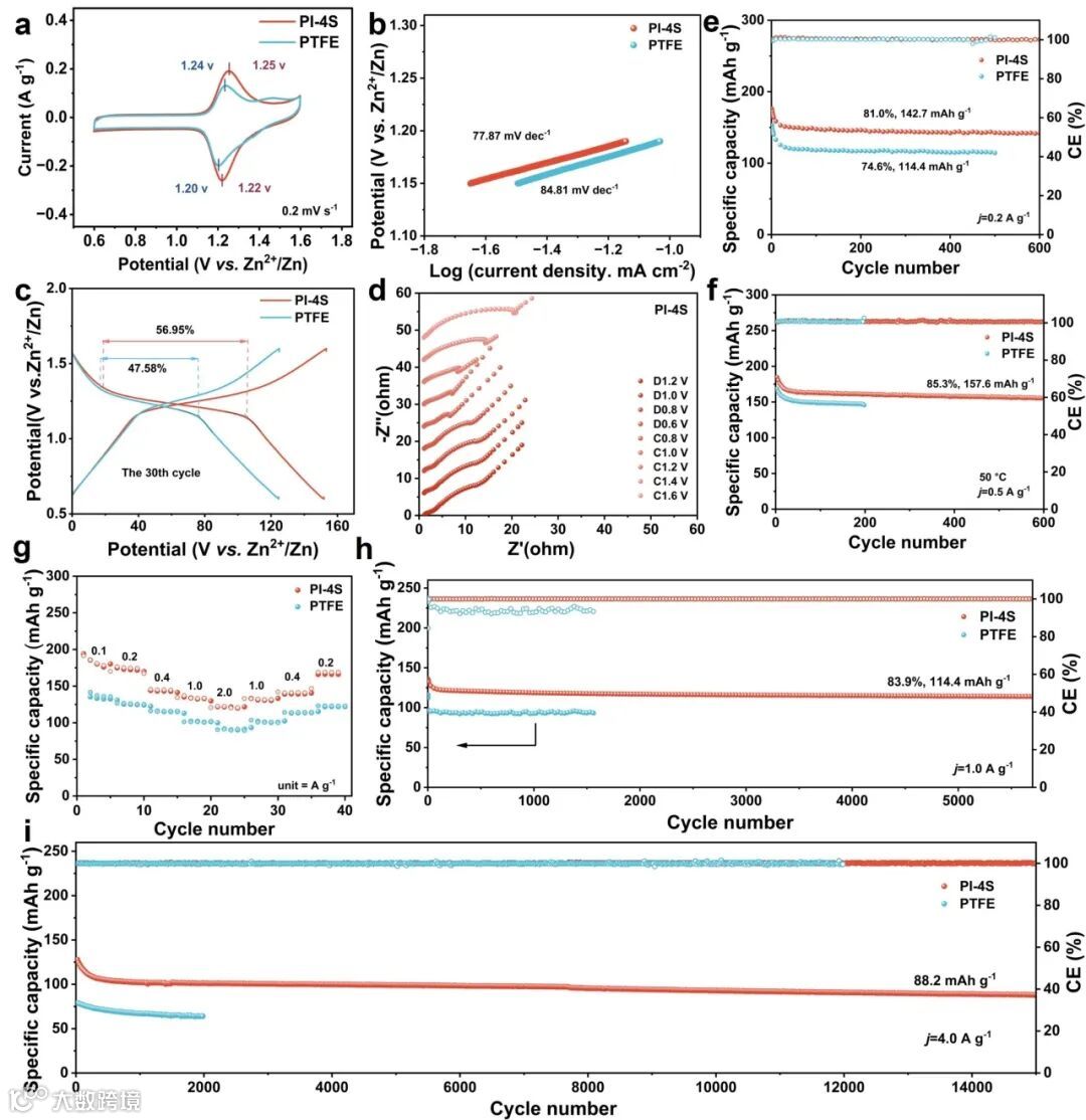 图2基于不同粘结剂的AC@I2正极(a)在0. 2 mV s-1时的CV曲线;(b)还原过程对应的Tafel斜率和(c)在30th循环时恒电流充放电曲线;(d)以PI-4S为粘结剂的AC@I2正极在不同充放电状态下的原位EIS曲线;采用不同粘结剂AC@I2正极(e)在0. 2 A g-1下的循环性能;(f)在50 ℃高温0.5 A g-1下的循环稳定性;(g)在0.1、0.2、0.4、1.0和2.0 A g-1下的倍率性能;(h)1.0 A g-1和(i)4.0 A g-1下的长循环性能。