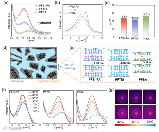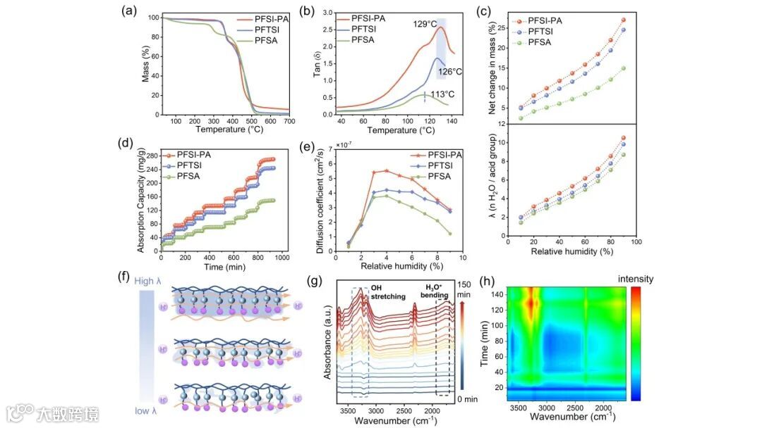 动态机械热分析(DMA)表明PFSI-PA的玻璃化转变温度是129℃,PFTSI为126℃,而PFSA是113℃(图3b)。这种现象可能归因于PFMA离子聚集体中存在的增强的静电相互作用,作为阻碍链段远程运动的交联。此外,侧链内的刚性苯环引入了位阻,从而降低了侧链的柔韧性,因此PFMA能在高温环境工作。水传输行为在质子输运过程中起着关键作用。采用动态蒸汽吸附法(DVS)研究了样品在80°C时的水扩散行为。PFSI-PA具有强大的吸水能力和水扩散能力,这种改善的吸水性能可以归因于这些聚合物中存在大量的酸性活性位点,促进了与水分子建立多个氢键。湿度水平升高意味着水合作用增加,从而产生额外的传输途径,加速水和质子的传输,这一结果表明,侧链含有多个酸官能团的膜具有增强的吸水性,更长的侧链有助于增加自由体积,允许容纳更多的水分子,即使在低湿度条件下,也能保证水分子的传输。