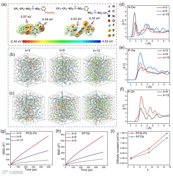 图5. DFT和MD模拟计算验证PFSI-PA和PFTSI的水合质子和水分子的传输能力。