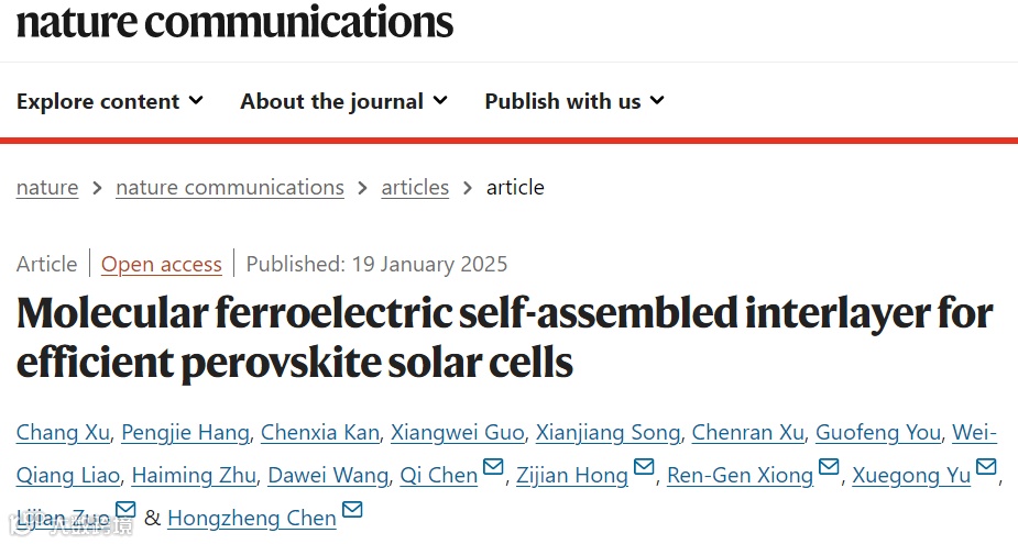 近日,浙江大学左立见和陈红征教授团队与浙江大学洪子健研究员和余学功教授、南昌大学熊仁根教授以及中国科学院苏州纳米所陈琪教授合作,在国际知名期刊 Nature Communications上发表题为“Molecular ferroelectric self-assembled interlayer for efficient perovskite solar cells”的研究成果,开发了一种使用自组装铁电层来修饰钙钛矿太阳能电池界面特性的策略。